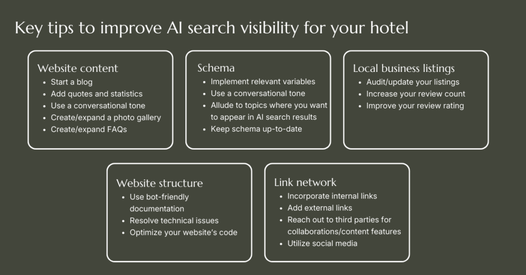 There are 5 main categories where your hotel can optimize for improved AI search visibility: